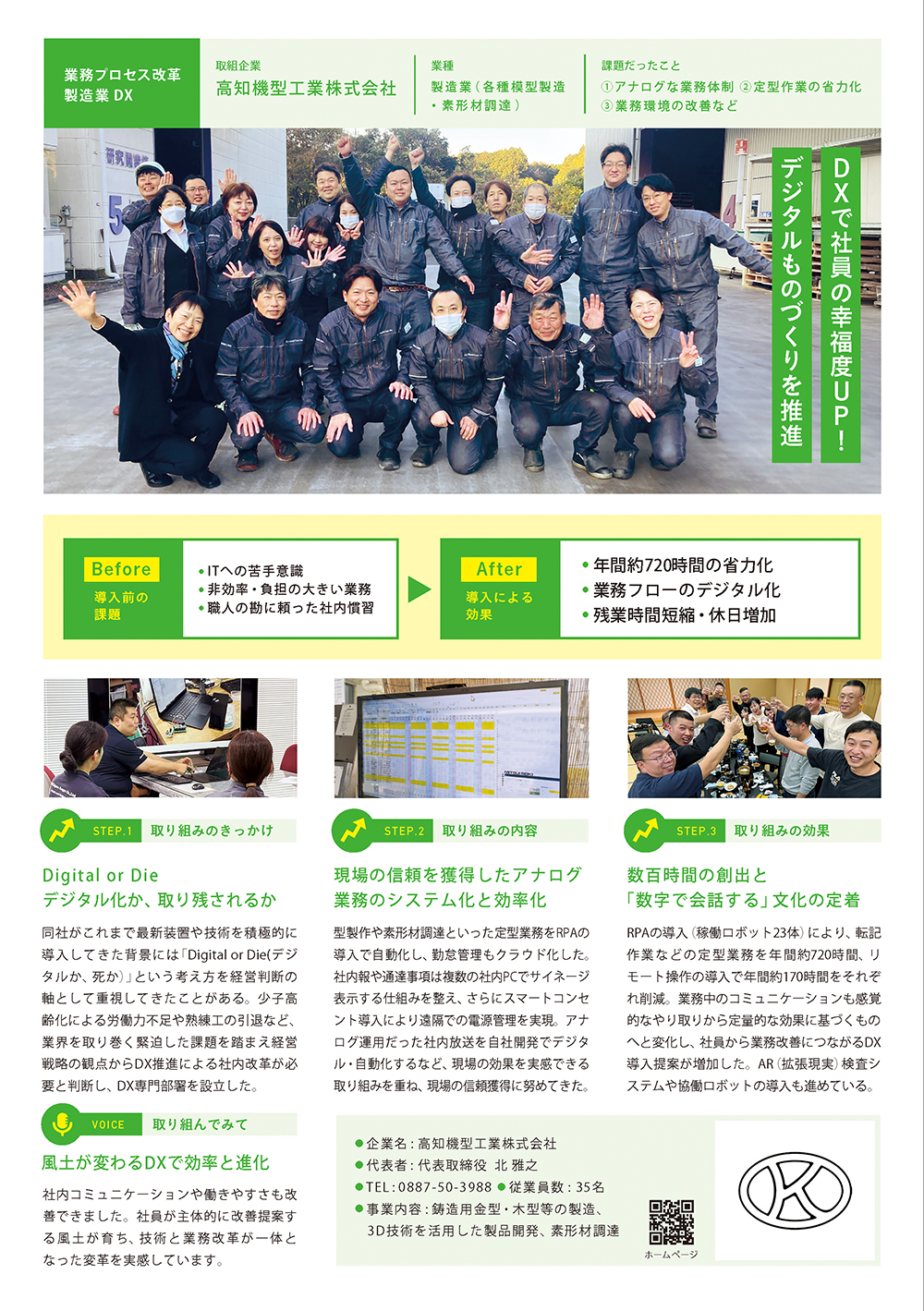 RPAの導入(稼働ロボット23体)により、転記作業などの定型業務を年間約720時間、リモート操作の導入で年間約170時間をそれぞれ削減。業務中のコミュニケーションも感覚的なやり取りから定量的な効果に基づくものへと変化し、社員から業務改善につながるDX導入提案が増加した。AR(拡張現実)検査システムや協働ロボットの導入も進めている。