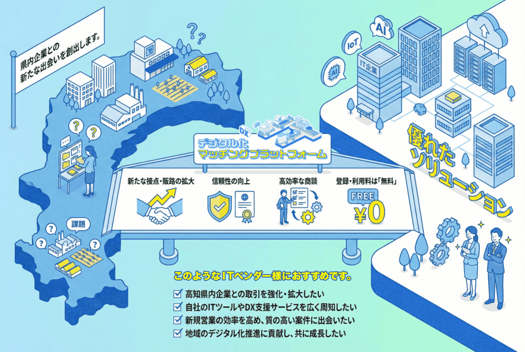 高知県デジタル化マッチングプラットフォームは、県内企業の「デジタル化で解決したいお困りごと」と、貴社の「優れたソリューション」を繋ぐ架け橋です。本プラットフォームに登録することで、以下のようなメリットがあります。